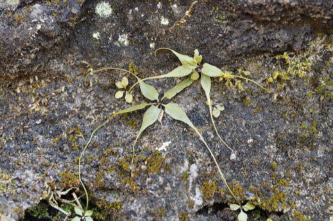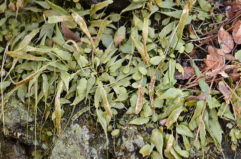 石灰岩上などで見られる常緑性のシダで、葉を放射状に広げ、葉先が細く伸びて子株をつけます。